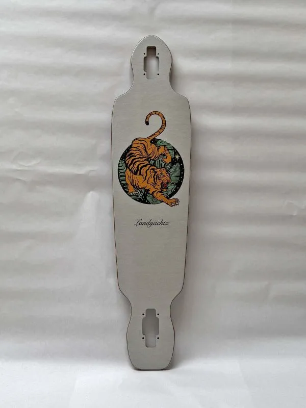 This board has been a cornerstone of the Landyachtz downhill lineup for nearly two decades, trusted by World Champions and numerous race winners. Measuring 39″ in length and 9.8″ in width, with a wheelbase ranging from 31.7″ to 32.2″, the Evos dimensions are optimized for downhill stability and control. The nose truck mount is angled at +10%, providing more front end steering, the tail truck mount in angled at -10%, reducing rear steering, these angles combine to provide ultimate control and stability. The deep concave and drop-down profile create secure foot pockets, enhancing rider confidence during high-speed runs. The wheel cut outs allow for large wheels to be run while minimizing the risk of wheelbite. This combined with the drop down platform means you get the best of both worlds-a low to the ground stable board that can handle large wheels
