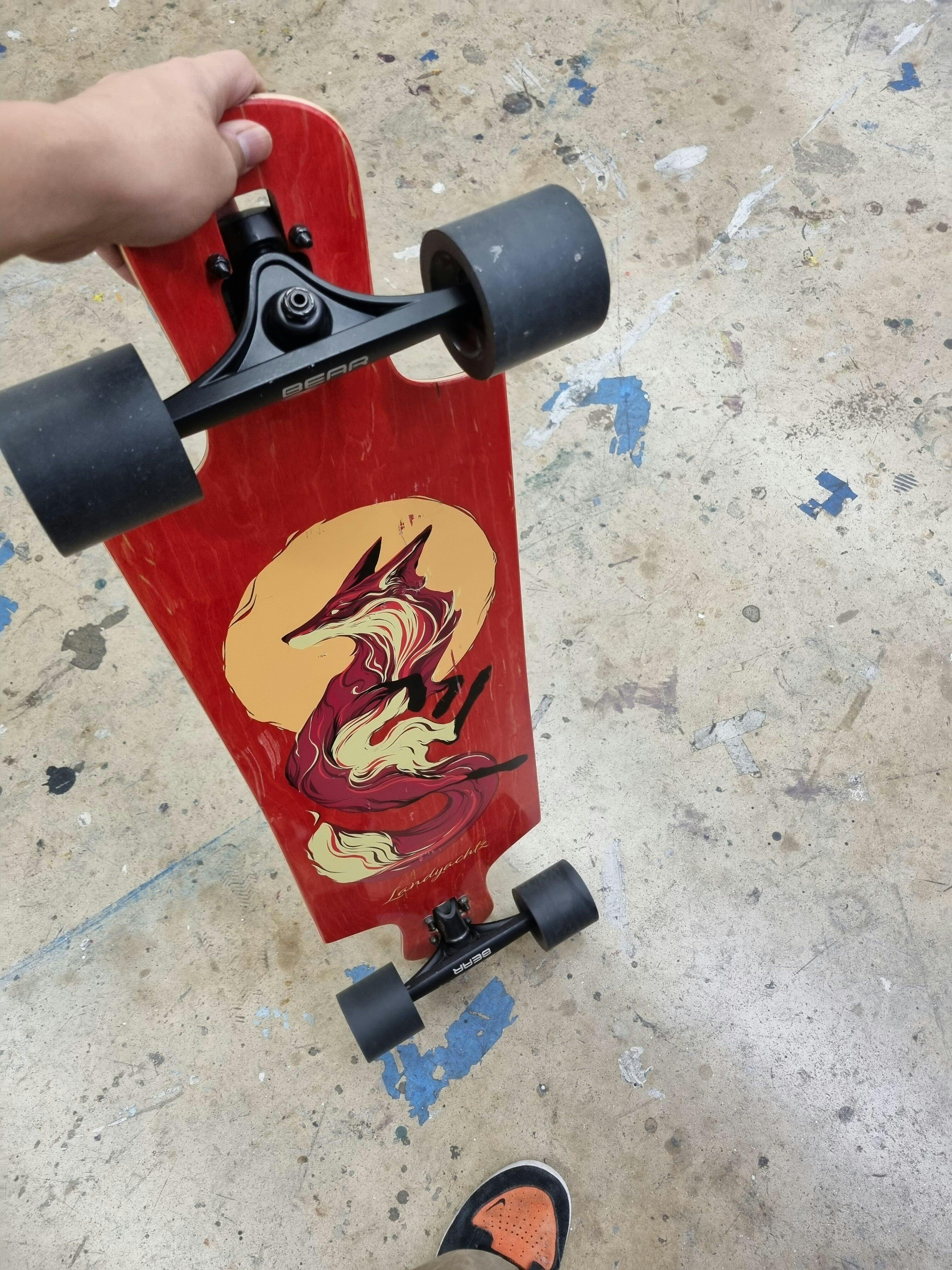 We purchased 2 longboards, one was this one because of the red fox design on it, but my teen son actually prefers how the switchblade 40 feels and rides for a beginner he feels more stable and comfortable on the other board. But this design was so much cooler. This ends up being the board that goes with him in the car everywhere for him to use when we are around town or at Montgomery whitewater to ride around their paved areas. Would be awesome to have this design available on other boards as an option so we don’t have to choose between cosmetics vs what he’s more comfortable riding on. We are a complete beginner starting from scratch so we do not have a knowledgeable review on specs etc just our personal experience and how he finds the switchblade 40 length and grooves for his feet easier and more secure feeling for him to learn on then this one.